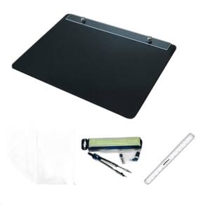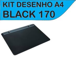 1- prancheta de 3mm, com acabamento superficial preto, resistente. Utiliza prendedores rosqueáveis no aperto da régua de acrílico. Dimensões aproximadas: 25x35 cm. Utilizada em desenhos técnicos, arquitetura, engenharias e cursos assimilados.