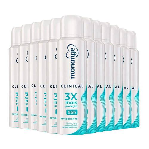 O Desodorante Aerosol Monange Clinical Revigorante garante 3 vezes mais proteção e até até 96 horas de duração, graças a sua tecnologia total controle. Possui fragrância delicada e revigorante que oferece proteção com ação antitranspirante e desodorante para mulheres que não abrem mão da segurança e conforto no dia a dia. Testado dermatologicamente, o antitranspirante não possui álcool em sua fórmula.