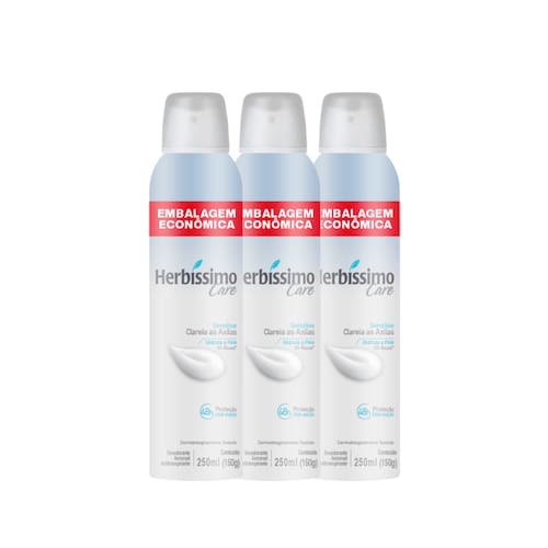 Desodorante Aerossol Antitranspirante Herbíssimo Care Sensitive é formulado com uma exclusiva tecnologia clareadora que cuida da pele, promovendo uma aparência uniforme e mantendo as axilas lindas e saudáveis. Ele clareia as axilas, hidrata a pele e oferece 48 horas de proteção e hidratação, sendo dermatologicamente testado e livre de álcool. Especificações:0% ÁlcoolProteção e hidratação por 48 horasDermatologicamente testadoPrecauções:Inflamável. Não pulverizar perto do fogo.Não perfurar nem incinerar.Não expor ao sol nem a temperaturas superiores a 50ºC.Usar somente nas axilas e proteger os olhos durante a aplicação.Manter fora do alcance de crianças.Evitar inalação deste produto.Usar somente nas áreas indicadas.Não aplicar sobre a pele irritada ou lesionada.Caso ocorra irritação e/ou prurido no local da aplicação, suspender o uso imediatamente.Não deixar embalagem de aerossol dentro de veículo, pois há risco de vazamento e explosão.Importante: Inofensivo para a camada de ozônio. Não contém CFC.Uso externo. Não ingerir.