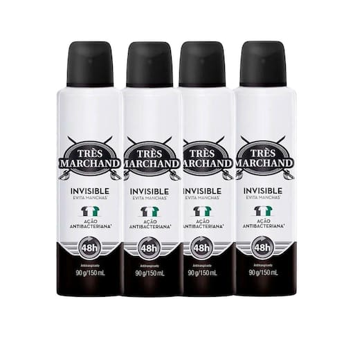 O Kit Desodorante Aerossol Très Marchand Invisible 150ml - 4 Unidades proporciona um toque de sensualidade, ideal para o dia e principalmente à noite. Sua Fórmula proporciona 48 horas de proteção, deixando uma sensação de segurança e bem estar durante o dia, Além de possuir Formula antitranspirante. Conta ainda com ação invisible anti-machas.