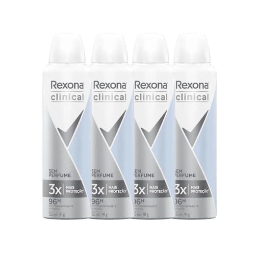O Kit Desodorante Antitranspirante Aerosol Rexona Clinical Sem Perfume 150ml - 4 Unidades proporciona proteção máxima para as axilas, sua fórmula eficaz oferece 3X mais proteção que um antitranspirante comum. O Rexona Clinical Sem Perfume possui a inovadora fórmula termo-ativa e conta com a exclusiva tecnologia Defense+, que se adapta ao organismo, ajudando a prevenir a transpiração e o mau odor, além de proporcionar até 96 horas de proteção, mantendo você mais fresca e segura. Dermatologicamente testado.