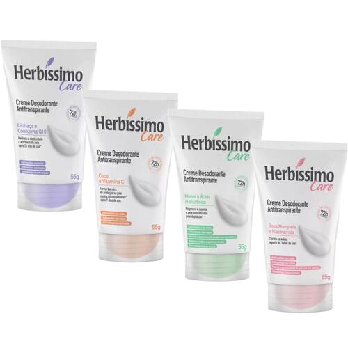 1 Desodorante em Creme Herbíssimo Antitranspirante Rosa Mosqueta e Niacinamida 55g 1 Desodorante em Creme Herbíssimo Antitranspirante Monoi e Ácido hialurônico 55g 1 Desodorante em Creme Herbíssimo Antitranspirante Linhaça e Coenzima Q10 55g 1 Desodorante em Creme Herbíssimo Antitranspirante Coco e Vitamina C 55g