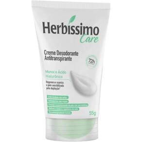 Desodorante Herbíssimo creme antitranspirante Monoi e Ácido Hialurônico, regenera e suaviza a pele sensibilizada pela depilação, antirresíduos nas axilas, antimanchas nas roupas, previne o escurecimento da pele com uso continuo, melhora a textura e aparência da axila, dermatologicamente testado.