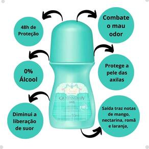 Elaborado com ingredientes ativos que garantem total proteção contra os odores da transpiração, deixando um suave perfume e promovendo uma sensação de frescor o dia todo. A fórmula do desodorante roll-on Giovanna Baby é composta por agentes hidratantes para dar um toque de suavidade e maciez ao seu corpo.