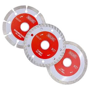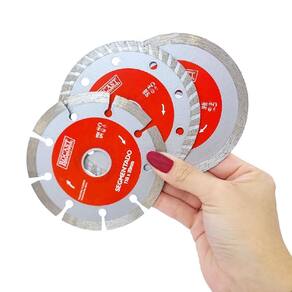 Marca: RocastO Kit Disco Diamantado Segmentado - Turbo - Liso com 3 pçs 34,0018 - Rocast, acompanha 1 Disco diamantado segmentado, ideal para cortes de materiais mais robustos, como concreto, tijolo, telha e alvenaria, 1 Disco diamantado turbo, ideal para realizar cortes em materiais como mármores, granitos, pedras decorativas e alvenaria e 1 Disco diamantado liso, ideal para cortar pedras, azulejos, cerâmica e porcelanato.