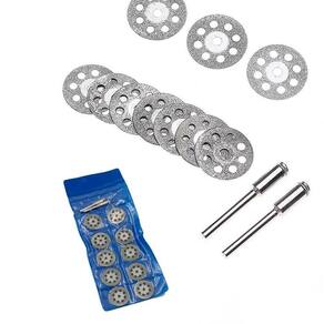 - marca: dremax - diâmetro do eixo das hastes: 3mm - diâmetro dos discos diamantados: 22mm - diâmetro dos discos de fibra de vidro: 32mm - diâmetro dos discos de corte: 24mm - ideal para trabalhos de precisão, artesanato, fabricação de jóias e bijuterias - indicado para cortes precisos nos seguintes materiais: metais, pedras preciosas, qualquer tipo de vidro exceto temperado , cerâmica, porcelana, pisos, azulejo. Coral, marinho, quartzo, cristais, e também diversos tipos de rocha como mármore e granito. - apresenta também ótimos resultados em cortes de resina e diversos tipos de plástico e acrílico. - compatível com todas as marcas de micro retíficas - pode ser utilizado com qualquer micro retíficas de qualquer marca desde que tenha a pinça de 3mm padrão - garantia: 90 dias contra defeitos de fabricação