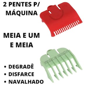 KIT PENTE DE DISFARCE 0,5 E 1,5 PARA MÁQUINAS DE CORTEPentes de excelente qualidade, compatível com todas as Máquinas de Corte:O Pente de Disfarce 0.5 e 1.5mm é especialmente feito para cortes mais precisos de fade o tão famoso degrade.- Faz também as linhas de disfarce mais facilmente.Excelente para quem já possui as máquinas Kemei, e quer melhorar ainda mais a experiência e a qualidade.Conteúdo do pacote:1 x Pente de 0.51 x Pente de 1.5===================================================================Todos nossos produtos com 30 dias de garantia.Todos nossos produtos são a pronta entrega. Após a confirmação do pagamento seu pedido é enviado em até 24h.Temos Satisfação em te Oferecer Produtos de Alta Qualidade!Todas as fotos de nossos produtos são reais.Adicione seus produtos no carrinho e Boas Compras!!!Qualquer dúvida estamos á disposição!Temos Satisfação em Atendê-lo (a).