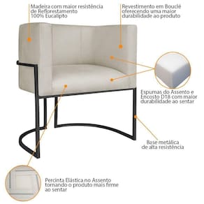 Especificações Técnicas da Poltrona Luna Base de Ferro: - Altura: 80 cm; - Largura: 78 cm; - Profundidade: 62 cm; - Altura do Assento: 50 cm; - Largura do Assento: 52 cm; - Altura do Encosto: 31 cm; - Espessura do Assento: 13 cm; - Espessura do Encosto: 12 cm; - Peso Suportado: 120 kg.