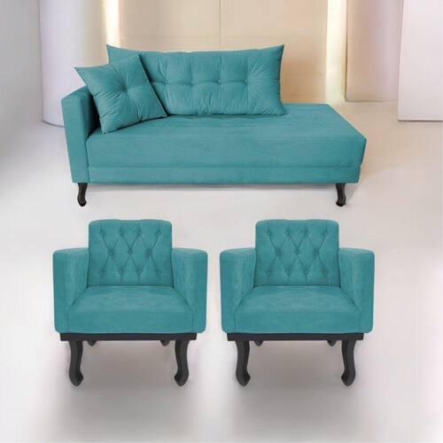 Kit Diva Recamier Azura 160cm Lado Direito E 02 Poltronas Classic Suede - Doce Sonho Móveis Cor Azulturquesa