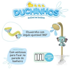 Comprando neste anúncio, você garante um mimo especial para tornar a hora do banho ainda mais divertida: um kit super fofo com bichinhos de borracha que fazem barulho ao apertar Ideal para entreter, estimular os sentidos e transformar o banho em um momento de alegria para os pequenos. Agora, falando da estrela do show... A Duchinha de Banho Infantil - Elefantinho foi pensada para deixar o banho mais prático, seguro e cheio de diversão Seu design lúdico com carinha de elefante encanta os pequenos e ajuda os papais e mamães na hora de lavar com carinho. Com chuveirinho de ângulo ajustável em 360, essa duchinha é super versátil e fácil de manusear. Ela possui ventosas para fixação segura na parede do banheiro e um sistema de bombeamento eficiente e protegido, garantindo tranquilidade durante o uso. Além disso, funciona com 4 pilhas AAA não inclusas , facilitando o uso mesmo fora do chuveiro, em banheiras ou piscinas infláveis, por exemplo. Ideal para bebês a partir dos 4 meses, essa duchinha é um verdadeiro aliado para tornar o banho um momento de conexão e alegria. Dimensões aproximadas: 67 x 10 x 5 cm Utiliza 4 pilhas AAA não inclusas Indicação: a partir de 4 meses Sobre o mimo especial incluso: Kit com bichinhos que fazem barulho ao serem apertados, produzidos em plástico seguro, livre de BPA e ftalatos. Acompanha uma mini banheirinha para guardar e brincar com os bichinhos durante o banho. Um toque extra de fofura e diversão que vai conquistar os pequenos Marca: Não Informado Ean: 7795028369293