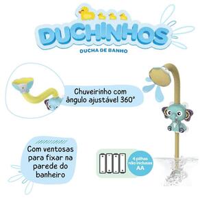 Comprando neste anúncio, você garante um mimo especial para tornar a hora do banho ainda mais divertida: um kit super fofo com bichinhos de borracha que fazem barulho ao apertar Ideal para entreter, estimular os sentidos e transformar o banho em um momento de alegria para os pequenos. Agora, falando da estrela do show... A Duchinha de Banho Infantil - Elefantinho foi pensada para deixar o banho mais prático, seguro e cheio de diversão Seu design lúdico com carinha de elefante encanta os pequenos e ajuda os papais e mamães na hora de lavar com carinho. Com chuveirinho de ângulo ajustável em 360, essa duchinha é super versátil e fácil de manusear. Ela possui ventosas para fixação segura na parede do banheiro e um sistema de bombeamento eficiente e protegido, garantindo tranquilidade durante o uso. Além disso, funciona com 4 pilhas AAA não inclusas , facilitando o uso mesmo fora do chuveiro, em banheiras ou piscinas infláveis, por exemplo. Ideal para bebês a partir dos 4 meses, essa duchinha é um verdadeiro aliado para tornar o banho um momento de conexão e alegria. Dimensões aproximadas: 67 x 10 x 5 cm Utiliza 4 pilhas AAA não inclusas Indicação: a partir de 4 meses Sobre o mimo especial incluso: Kit com bichinhos que fazem barulho ao serem apertados, produzidos em plástico seguro, livre de BPA e ftalatos. Acompanha uma mini banheirinha para guardar e brincar com os bichinhos durante o banho. Um toque extra de fofura e diversão que vai conquistar os pequenos Marca: Não Informado