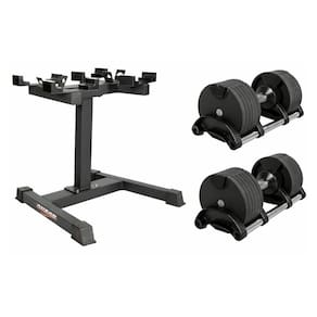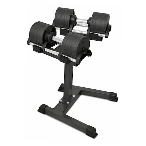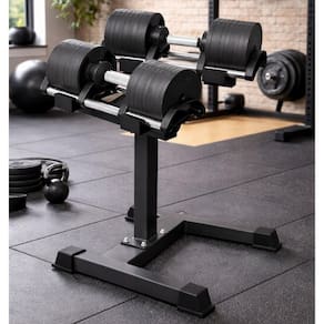 Graças à tecnologia de mudança rápida, você altera a carga com apenas uma das mãos: basta girar a alça enquanto o haltere está na base para selecionar o peso desejado. O suporte (Rack) incluso não apenas organiza o ambiente, mas coloca os pesos na altura ideal para uma pegada segura, evitando esforços desnecessários na coluna ao levantar a carga do chão. É a união perfeita entre tecnologia, segurança e design.