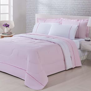 Kit Edredom 100% Algodão Percal 150 Fios Dupla Face Solteiro Jogo De Cama 5 Peças - Rosa-branco