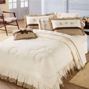 O Edredom Naturale possui detalhe com babado estampado em poa, matelado no formato de borboletas, acompanha dois porta travesseiros com babado e bordados delicados e para compor o Kit, uma linda almofada com um lindo laço.