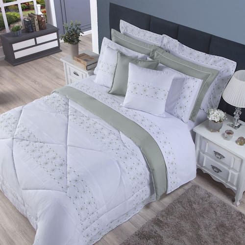 Kit Edredom Damasco King 11 Peças 100% Poliéster 200 Fios - Cinza Eleve o nível de sofisticação do seu quarto com o Kit Edredom Damasco King. Desenvolvido para quem busca o máximo de conforto, este conjunto é confeccionado em tecido micropercal 200 fios e se destaca pelo elegante acabamento bordado. O toque macio e incomparável do tecido e os detalhes primorosos vestem a cama king com perfeição, criando um ambiente luxuoso e acolhedor.