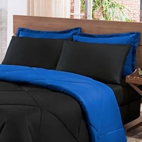 Kit Edredom + Jogo De Lençol Aconchego Look House Dupla Face Casal King 06 Peças - Preto E Azul O Kit Look House, traz para seu ambiente um conjunto de roupas de cama com todas as peças que você precisa para deixar seu ambiente aconchegante, sem contar o conforto para as noites de sono. Produto composto por:01 Edredom 2,80m x 2,50m01 Lençol de baixo c/ elástico para colchão de 1,98m x 2,03m x 0,30cm02 Porta travesseiros 70cm x 50cm02 Fronhas de 70cm x 50cm Composição tecido: 80% Algodão / 20% Poliéster Ean: 7908618406074
