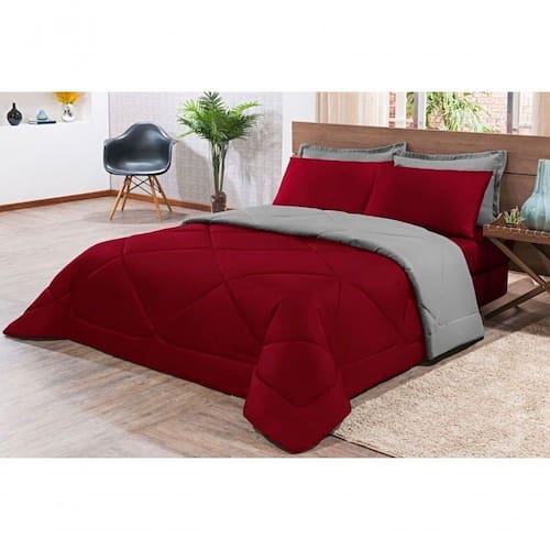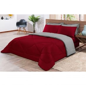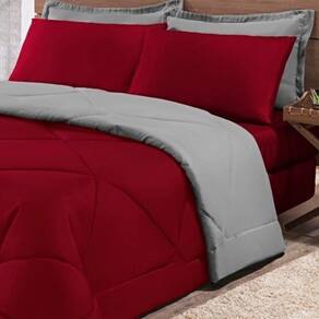 Kit Edredom + Jogo De Lençol Aconchego Look House Dupla Face Casal King 06 Peças - Vermelho E Cinza O Kit Look House, traz para seu ambiente um conjunto de roupas de cama com todas as peças que você precisa para deixar seu ambiente aconchegante, sem contar o conforto para as noites de sono. Produto composto por:01 Edredom 2,80m x 2,50m01 Lençol de baixo c/ elástico para colchão de 1,98m x 2,03m x 0,30cm02 Porta travesseiros 70cm x 50cm02 Fronhas de 70cm x 50cm Composição tecido: 80% Algodão / 20% Poliéster