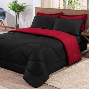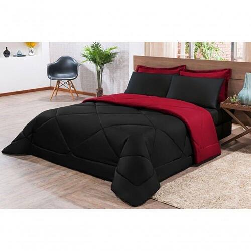 Kit Edredom + Jogo De Lençol Aconchego Look House Dupla Face Casal Queen 06 Peças - Preto/ Vermelho O Kit Look House, traz para seu ambiente um conjunto de roupas de cama com todas as peças que você precisa para deixar seu ambiente aconchegante, sem contar o conforto para as noites de sono. Produto composto por: 01 Edredom 2,50m x 2,20m 01 Lençol de baixo c/ elástico para colchão de 1,58m x 1,98m x 0,30cm 02 Porta travesseiros 70cm x 50cm 02 Fronhas de 70cm x 50cm Composição tecido: 80% Algodão / 20% Poliéster Marca: Enxovais Davy | Estampa: Não se Aplica | Medidas: 01 Edredom 2,50m x 2,20m01 Lençol de baixo c/ elástico para colchão de 1,58m x 1,98m x 0,30cm02 Porta travesseiros 70cm x 50cm02 Fronhas de 70cm x 50cm | Número de Peças: 06 Peças | Material: Poliéster | Cor Predominante: Preto/ Vermelho | Cama Indicada: Queen