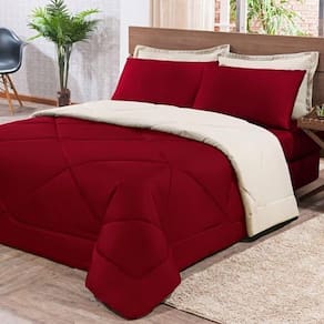Kit Edredom + Jogo De Lençol Aconchego Look House Dupla Face Casal Queen 06 Peças - Vermelho E Palha O Kit Look House, traz para seu ambiente um conjunto de roupas de cama com todas as peças que você precisa para deixar seu ambiente aconchegante, sem contar o conforto para as noites de sono. Produto composto por:01 Edredom 2,50m x 2,20m01 Lençol de baixo c/ elástico para colchão de 1,58m x 1,98m x 0,30cm02 Porta travesseiros 70cm x 50cm02 Fronhas de 70cm x 50cm Composição tecido: 80% Algodão / 20% Poliéster