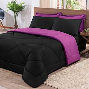 Kit Edredom + Jogo De Lençol Aconchego Look House Dupla Face Solteiro 04 Peças - Preto/ Roxo O Kit Look House, traz para seu ambiente um conjunto de roupas de cama com todas as peças que você precisa para deixar seu ambiente aconchegante, sem contar o conforto para as noites de sono. Produto composto por: 01 Edredom 2,40m x 1,60m 01 Lençol de baixo c/ elástico para colchão de 1,88m x 88cm x 0,30cm 01 Porta travesseiros 70cm x 50cm 01 Fronhas de 70cm x 50cm Composição tecido: 80% Algodão / 20% Poliéster Marca: Enxovais Davy | Estampa: Não se Aplica | Medidas: 01 Edredom 2,40m x 1,60m01 Lençol de baixo c/ elástico para colchão de 1,88m x 88cm x 0,30cm01 Porta travesseiros 70cm x 50cm01 Fronhas de 70cm x 50cm | Número de Peças: 04 Peças | Material: Poliéster | Cor Predominante: Preto/ Roxo | Cama Indicada: Solteiro