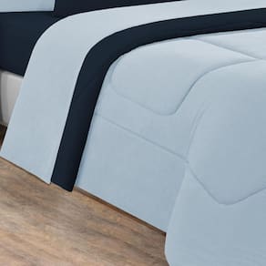 Marca: Enxovais Davy | Estampa: Não se Aplica | Medidas: 01 Edredom Solteiro Dupla Face Liso 1,60m x 2,40m01 Porta Travesseiro 70cm x 50cm01 Lençol de Cima 1,60m x 2,40m 01 Lençol de Baixo para Colchão 0,88m x 1,88m x 0,30m (Elástico em toda a volta)01 Fronha 70cm x 50cm | Número de Peças: 05 Peças | Material: Agodão | Cor Predominante: Azul Bebê/Azul Marinho | Cama Indicada: Solteiro
