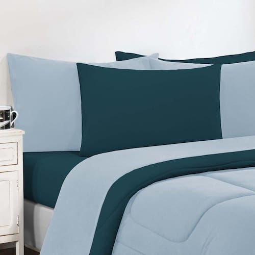 Marca: Enxovais Davy | Estampa: Não se Aplica | Medidas: 01 Edredom King Dupla Face Liso 2,50m x 2,90m02 Porta Travesseiros 70cm x 50cm01 Lençol de Cima 2,50m x 2,90m 01 Lençol Casal de Baixo para colchão 1,93m x 2,03m x 0,30m (Elástico na volta toda)02 Fronhas 70cm x 50cm | Número de Peças: 07 Peças | Material: Agodão | Cor Predominante: Azul Bebê/Azul Petróleo | Cama Indicada: King