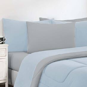 Marca: Enxovais Davy | Estampa: Não se Aplica | Medidas: 01 Edredom Queen Dupla Face Liso 2,20m x 2,40m02 Porta Travesseiros 70cm x 50cm01 Lençol de Cima 2,50m x 2,40m 01 Lençol Casal de Baixo para colchão 1,58x1,98x0,30 (Elástico na volta toda)02 Fronhas 70cm x 50cm | Número de Peças: 07 Peças | Material: Agodão | Cor Predominante: Azul Bebê/Cinza | Cama Indicada: Queen