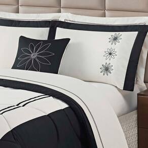 Kit edredom marguerite queen 05 peças 100% poliéster preto O kit marguerite queen é composto por 01 edredom pantografado muito confortável, volumoso e aconchegante, além deste item, o kit ainda conta com mais 02 porta travesseiros, 01 capa de almofada e 01 refil de almofada.A coleção marguerite é confeccionada em tecido 100% poliéster e elabora em três cores.O kit marguerite queen é composto por 01 edredom pantografado muito confortável, volumoso e aconchegante, além deste item, o kit ainda conta com mais 02 porta travesseiros, 01 capa de almofada e 01 refil de almofada.Precisamos destacar que neste kit os porta travesseiro e a capa de almofada são bordados. Conteúdo da embalagem- 01 edredom com medidas de 2,60 m x 2,40 m- 02 porta travesseiros com medidas de 70 cm x 50 cm- 01 capa de almofada com medidas de 40 cm x 40 cm- 01 refil de almofada com medidas de 40 cm x 40 cm Composição textil- tecido: microfibra 100% poliéster- enchimento: 100% poliéster Ficha técnica- quantidade de peças: 05- cor: preto- bordado: sim- fabricação: pantografado Orientações para lavagem- processo de lavagem muito suave, de preferência manual;- lavar com temperatura máxima de 40°c;- não deixar o produto de molho, pois roupas de cama de cor forte podem desbotar;- utilizar sabão neutro;- evite sabão do tipo limpeza profunda e/ou tira manchas;- não alvejar / não branquear;- não secar em secador rotativo não utilizar secadora ;- não lavar/limpar a seco;- não passar;- vapor pode causar danos irreversíveis. Atenção- jogo de cama vendido separadamente.- verificar as dimensões do produto antes da compra.- é necessário levar em consideração a altura da cama ou a altura do box da cama + colchão, para que o caimento do produto seja perfeito.- siga as "orientações para lavagem" para aumentar a vida útil das peças- variação das cores pode ocorrer de acordo com o monitor.- as peças decorativas não estão inclusas neste produto.- foto ilustrativa.