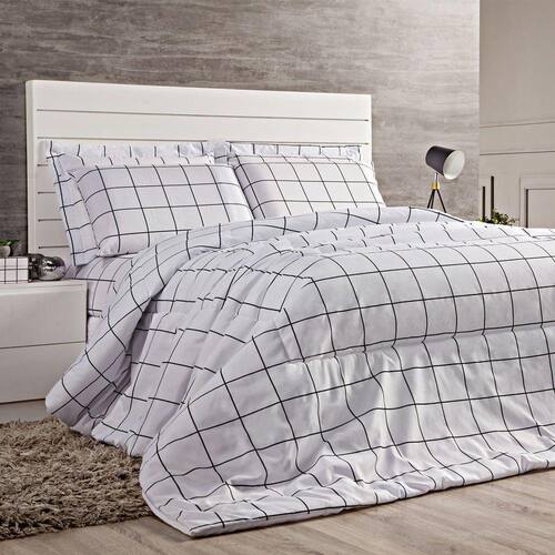 Kit Edredom Queen Atual Estampa Grid Casaborda 3 Peças A coleção Atual é moderna e descolada. O lindo Kit de Edredom em estampa Grid torna o ambiente mais descontraído e leve. Confeccionada em 180 fios, tecido 100% algodão. O porta traveseiro também é confeccionado em estampa Grid. Conheça também o Jogo de Lençol, e adquira a coleção completa, deixando seu quarto ainda mais legal!Composição:1 edredom 2,60m x 2,40m2 porta travesseiros 75cm x 55cm Tamanho - Queen
