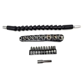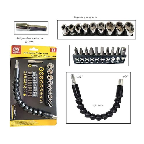 Kit Eixo Extensor Flexível Chicote Universal com Soquete Bits Eixo Extensor Flexível universal é ideal para ser conectado em parafusadeira e chave catraca manual não inclusos auxiliando a realização de trabalhos em lugares apertados e de difícil alcance, facilidade em Apertar ou desapertar parafusos em lugares de difícil acesso e pode ser em curva, proporcionando excelente custo benefício; é só trocar os bits e usar Philips, fenda, allen, torx, soquete. A proteção de saída flexível protege sua mão enquanto o eixo gira. Contém: 1 eixo flexível universal 250mm pontas de 1/4 10 bits de chave: Fenda: SL 4, SL5, SL6 Phillips: Ph1, Ph2, Pz1, Pz2 Torx T-10 e T-15 ADP 1 adaptador e extensor soquete 45mm 9 soquetes: 5,6,7,8,9,10,11,12 e 13mm Composição: Metal Marca: Não Informado Ean: 7890592539599