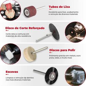 Kit Eixo Flexível chicote com 105 Acessórios para Micro Retífica Completo Dremax. Com 105 peças para lixar, polir, cortar, esmerilhar, limpar, gravar, desbastar, furar, etc. Eixo Flexível para Micro Retíficas Multimarcas Chicote 1 metro Dremax - Marca: Dremax - Comprimento: 1 metro - Compatível com as principais micro retíficas do mercado, como Dremel 3000, Hammer, Wesco, Mondial, Titanium, Gamma, Einhell, Sagyma, Nove54, Vonder, AWT, Fort, Dexter, Black Decker, Charbs, Mallory, Western, entre outras. - Não adapta a Dremel 4.000 - Ideal para trabalhos delicados de precisão - Excelente dissipação de calor, não aquece o cabo - Ideal para lugares difíceis de alcançar e trabalhos finamente detalhados - É recomendado a lubrificação dos rolamentos para aumento de vida útil e resfriamento do conjunto - Qualidade - Comprimento do eixo: 80cm - Comprimento total: 1.08 metro - Acompanha chave em L para travar o mandril Kit 105 Acessórios para Micro Retífica Completo Dremax - Marca: Dremax - Kit completo com 105 peças para lixar, polir, esmerilhar, limpar, gravar, desbastar e furar - Hastes de 3mm padrão de todas as micro retíficas - Uso em micro retíficas de qualquer marca - Peso bruto: 162 gramas - : 90 dias contra defeitos de fabricação Itens Inclusos: - 1 Eixo Flexível - 3 Discos de Corte 32mm Reforçados - 35 Discos De Corte 24mm - 35 Discos De Lixa 20mm - 9 Tubos De Lixa 12,7mm - 1 Disco de Polimento 25,4mm - 6 Discos de Polimento 12,7mm - 1 Ponta de Feltro 10mm - 1 Ponta Montada 10mm Carboneto de Silício verde - 1 Ponta Montada 20mm Carboneto de Silício verde - 1 Ponta Montada 9,5mm Óxido de Alumínio laranja - 1 Ponta Montada 14,3mm Óxido de Alumínio laranja - 1 Ponta Montada 6mm Óxido de Alumínio rosa - 1 Ponta Montada 6mm Arredondada Óxido de Alumínio rosa - 1 Escova Copo 12mm Aço - 1 Escova 20mm Nylon - 1 Suporte para Tubo de Lixa 12,7mm - 1 Suporte para Discos de Corte e Lixa - 1 Suporte para Disco de Feltro - 1 Pasta de Polimento - 1 Pedra para Afiar - 2 Potes Plásticos