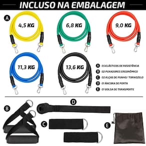 Bem vindo ao edicasa. Store, sua loja de produtos premium no. O kit extensor é perfeito para quem quer fortalecer, tonificar e definir os músculos. Ele vem com elásticos em forma de tubo feitos de látex de alta qualidade e resistência. Cada elástico tem diferentes resistências. É possível realizar os exercícios usando 1 ou até 5 elásticos ao mesmo tempo, criando assim mais de 30 níveis diferentes de resistência. Finalidades:- ganho de força- resistência- aumento de massa magra- tonificação muscular- melhora do condicionamento físicoespecificações e tensões dos extensores elásticos:- elástico preto 13,6 kg- elástico verde 11,3 kg- elástico azul 9 kg- elástico vermelho 6,8 kg- elástico amarelo 4,5 kgembalagem contém 11 itens e acessórios inclusos:- 05 extensores elásticos com diferentes resistência - 02 puxadores ergonômicos- 02 alças de punho ou tornozelo- 01 âncora de porta- 01 bolsa de transporte e armazenamentomaterial resistente: tpe / látex ecológicotamanho da caixa: 13x14x18 cmpeso da embalagem: 640grecursos do produto:1. A extensão de segurança prolongada é de 3 a 4 vezes, anti-oxidação, anti-desgaste, anti-estiramento, cor bonita, uniformidade, sem bolhas, sem riscos2. Este produto passou no teste internacional da sgs, proteção ambiental. Inofensivo para o corpo humano, feito de látex natural, com alta suavidade da superfície, forte resistência ao desgaste e elasticidade. Alça de nylon reforçado, almofada de espuma, mais confortável de usar, a interface é a versão mais recente e atualizada da interface do mosquetão, segura e elegante. 3. Use os extensores elásticos para exercitar as partes superior, média e inferior do corpo, o efeito modelador do corpo é notável. O efeito é melhor, especialmente para a prevenção de dor na coluna cervical, ombro e coluna lombar, pois tem um efeito preventivo muito ativo. Este produto está em estoque com. Todos os produtos da loja edicasa. Store, são enviados com. Estaremos a sua disposição para retirar qualquer dúvida. Atenciosamente, equipe edicasa. Store.