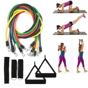 Kit de elásticos WCT FitnessINTENSIDADE DOS ELÁSTICOS:1 elástico amarelo (4,5 kg de resistência)1 elástico vermelho (6,5 kg de resistência)1 elástico azul (9 kg de resistência)1 elástico verde (11 kg de resistência)1 elástico preto (13,5 kg de resistência) Descrição técnica:Bolsa: 1 unidadeElásticos: 5 unidades de 1,25m de comprimento.Puxador de mão: 12,3cm de largura e 3cm de diâmetro.Puxador tornozeleira: 40cm de comprimento e 4cm de largura.Âncora de porta: 5cm de diâmetro com tecido com 26cm de comprimento.