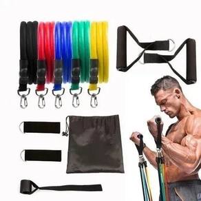Embalagem contém 11 itens e acessórios inclusos: - 05 extensores elásticos com diferentes resistência nas cores: amarelo, vermelho, azul, verde, preto ; - 02 puxadores ergonômicos; - 02 alças de punho ou tornozelo; - 01 âncora de porta; - 01 bolsa de transporte e armazenamento; - 01 guia de exercícios.