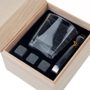 Para garantir que a sua bebida permaneça na temperatura ideal sem perder o sabor, o kit inclui três cubos de pedra-sabão reutilizáveis. Esses cubos são uma excelente alternativa para o gelo tradicional, pois resfriam sem diluir o whisky, permitindo que você desfrute do verdadeiro caráter da bebida.