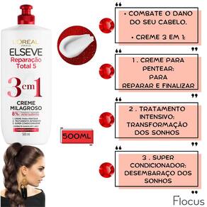 Kit Elseve Color Vive Óleo Extraordinário Cicatri Renov Bem vindo a a loja Flocus. É um prazer tê-lo a como nosso a cliente CONTEÚDO DO KIT: 1 Shampoo Protetor da Cor L'Oréal Paris Elseve Color Vive - 400ml 1 Condicionador Protetor da Cor L'Oréal Paris Elseve Color Vive - 400ml 1 Creme Milagroso 3 em 1 L'Oréal Paris Elseve - 500 ML 1 Leave-in de Tratamento L'Oréal Paris Elseve Cicatri Renov - 100ml 1 Óleo Extraordinário L'Oréal Paris Elseve - 100ml Os cabelos coloridos são mais sensíveis que os naturais. Lavagens repetidas, raios UV Ultra-Violeta e a poluição aceleram o ressecamento: a cor desbota e perde o brilho. Por isso, eles precisam de um tratamento específico Após anos de pesquisas, LOréal Paris desenvolveu o Elseve Colorvive, com a revolucionária tecnologia Nutri-Impermeabilizante. O resultado: são cabelos mais macios, nutridos e a cor radiante visivelmente prolongada. O Elseve Colorvive ajuda na proteção e impermeabilização dos fios contra as agressões externas com sua tecnologia Nutri-Impermeabilizante. A linha Elseve Reparação Total 5 atua contra os principais danos: Quebra, Rigidez, Opacidade, Ressecamento e Pontas Duplas. Com uma ação exclusiva da cicatri ceramida, repara já no 1º uso Ajuda a reduzir fios quebradiços, trazendo mais brilho e flexibilidade ao cabelo. Remove as pontas duplas e recupera a estrutura da fibra deixando os fios uniformes, selados e protegidos como se fosse uma cicatrização da fibra capilar. Para turbinar seu tratamento capilar, o kit contém o famoso e um dos mais vendidos Óleo de Tratamento Elseve Óleo Extraordinário Nutrição, pois ele tem a combinação perfeita de micro-óleos de flores preciosas, garantindo maciez e brilho aos cabelos. O segredo dos óleos de flores preciosas promovem uma nutrição perfeita e uma leveza infinita. Camomila Linhaça Girassol Gardênia Lótus Rosa Canina INDICAÇÃO: Ideal para quem tem cabelos coloridos, tingidos ou com mechas e deseja uma cor prolongada e os fios protegidos do raios UV. BENEFÍCIOS: Nutrir e prolonga a cor do seu cabelo, deixando com um brilho intenso. Hidratação do comprimento às pontas, com uma carga ideal para este tipo de cabelo. MODO DE USO: . 1 Passo: Shampoo: Aplique nos cabelos molhados e massageie suavemente; Enxágue. Repita a operação se necessário. . 2 Passo: Condicionador: Aplique o Condicionador em todo o comprimento até as pontas. Deixe o produto agir. Enxague abundantemente. . Creme Milagroso 3 formas de uso : Super Condicionador para Desembaraçar: Aplique em todo comprimento até as pontas. Deixe agir por 3 minutos e enxágue. Tratamento Intensivo para Transformar: Aplique em todo comprimento até as pontas. Deixe agir por 5 minutos ou mais e enxágue. Creme para Pentear para Nutrir e/ou Finalizar: Aplique no cabelo úmido ou seco, não enxágue e penteie como de costume. . Leave-in: Distribua uma pequena quantidade nos fios secos, do comprimento às pontas. Pode ser antes e depois da escova ou chapinha. Sem enxágue. . Óleo Extraordinário: O Óleo Extraordinário de tratamento é leve e multiuso, pode ser tanto em cabelos molhados quanto secos Pode ser antes da escova para nutrir os fios; como finalizador para malear a fibra; em qualquer momento para disciplinar o frizz e ressaltar a luz dos cabelos. OBS: Para uma cor mais intensa e de longa duração pinte seu cabelo com Imédia Excellence de L'Oréal Paris, coloração triplo cuidado, e use Elseve Colorvive para a manutenção, protegendo a cor e o brilho do fio. Agradecemos por escolher a Loja Flocus e por confiar em nós para cuidar da beleza dos seus cabelos. Qualquer dúvida, favor enviar sua pergunta Flocus