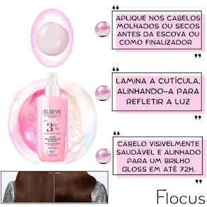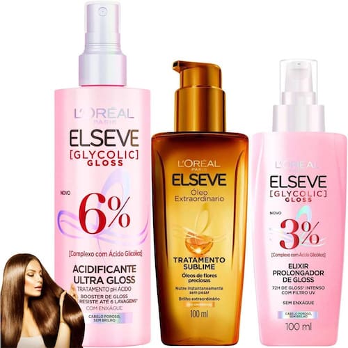 Kit Elseve Elixir Acidificante Glycolic Gloss Extraordinário Bem vindo a a loja Flocus. É um prazer tê-lo a como nosso a cliente CONTEÚDO DO KIT: 1 Sérum Elixir Prolongador de Gloss L'Oréal Paris Elseve Glycolic Gloss - 100ml 1 Óleo Extraordinário L'Oréal Paris Elseve - 100ml 1 Spray Acidificante Elseve Glycolic Gloss - 200ml Cabelo poroso e sem brilho A linha Elseve Glycolic Gloss de LOréal Paris garante 3X mais gloss que resiste a 6 lavagens. Sua fórmula com pH Ácido rica em Ácido Glicólico, combate a porosidade e sela as cutículas para um cabelo visivelmente saudável e alinhado para um brilho gloss. O sérum Prolongador de Gloss Elixir, com uma inovadora fórmula com pH ácido e enriquecida com 3% Complexo com Ácido Glicólico, filtro UV e proteção térmica, possui tripla ação: 1. Sela intensamente os fios, preenchendo as falhas da fibra capilar. 2. Na superficie, lamina a cutícula, alinhando-a para refletir a luz. 3. Protege os fios contra futuras agressões externas. Cabelo visivelmente saudável e alinhado para um brilho gloss que dura até 72h. O Óleo de Tratamento Elseve Óleo Extraordinário Nutrição tem a combinação perfeita de micro-óleos de flores preciosas, garantindo maciez e brilho aos cabelos. Sua fórmula rica em 6 óleos de flores raras da natureza é leve e se adapta a todos os tipos de cabelos. Perfeita mistura de ingredientes ativos que transforma todos os tipos de cabelos. O óleo promove brilho e nutrição intensa aos fios, controla o frizz, protege o cabelo de temperaturas elevadas, trata de maneira profunda na umectação capilar e turbina máscaras de tratamento através da sua mistura. O Óleo Extraordinário Elseve de L'Oréal Paris é um delicado óleo que proporciona tratamento para a beleza dos seus cabelos. Possui 6 óleos de flores preciosas, com efeito condicionante, capaz de transformar a fibra para tornar sublime qualquer tipo de cabelo. O segredo dos óleos de flores preciosas promovem uma nutrição perfeita e uma leveza infinita. Camomila Linhaça Girassol Gardênia Lótus Rosa Canina O Acidificante Capilar Ultra Gloss da linha Elseve Glycolic Gloss de LOréal Paris possui uma fórmula rica em Ácido Glicólico e pH ácido, este produto combate a porosidade dos fios desde o primeiro uso, impulsionando o gloss no cabelo. A aplicação regular do Acidificante Ultra Gloss resulta em um cabelo visivelmente saudável e alinhado, com um brilho gloss intenso. MODO DE USO: Acidificante Spray: Ainda com o condicionador aplicado, sem enxaguar, divida o cabelo em quatro partes: Use o spray diretamente nos fios cobrindo-os do comprimento as pontas, Em seguida, espalhe com as mãos Deixe agir por 5 minutos Enxague. OBS: É recomendado utilização 2x por semana ou quando sentir necessidade de um boost de brilho. Elixir: Aplicar nos cabelos molhados ou secos Pode usar antes da escova ou como finalizador para malear a fibra Sem enxágue. Óleo: O Óleo Extraordinário de tratamento é leve e multiuso, pode ser tanto em cabelos molhados quanto secos Pode ser antes da escova para nutrir os fios; como finalizador para malear a fibra; em qualquer momento para disciplinar o frizz e ressaltar a luz dos cabelos. Agradecemos por escolher a Loja Flocus e por confiar em nós para cuidar da beleza dos seus cabelos. Em caso de dúvidas, favor enviar sua pergunta Flocus Marca: Não Informado