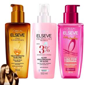 Kit Elseve Óleo Extraordiná Elixir Gloss Sérum Leave In Liso Bem vindo a a loja Flocus. É um prazer tê-lo a como nosso a cliente CONTEÚDO DO KIT: 1 Sérum Elixir Prolongador de Gloss L'Oréal Paris Elseve Glycolic Gloss - 100ml 1 Elseve Sérum Leave-in Liso Por 1 Semana Liso dos Sonhos L'oreal Paris - 100ml 1 Óleo Extraordinário L'Oréal Paris Elseve - 100ml Chegooou A nova linha Elseve Liso dos Sonhos proporciona cabelos lisos, alinhados e sem frizz por 1 semana O Sérum Leave-in LOréal Paris Elseve Liso dos Sonhos é um finalizador capilar desenvolvido para quem deseja um cabelo mais liso, alinhado e protegido contra a umidade. Sua tecnologia ativada por calor cria uma barreira invisível na fibra capilar, proporcionando um efeito de cabelos lisos por até 1 semana. Resultados que resistem até 5 lavagens O sérum Prolongador de Gloss Elixir, com uma inovadora fórmula com pH ácido e enriquecida com 3% Complexo com Ácido Glicólico, filtro UV e proteção térmica, possui tripla ação: 1. Sela intensamente os fios, preenchendo as falhas da fibra capilar. 2. Na superficie, lamina a cutícula, alinhando-a para refletir a luz. 3. Protege os fios contra futuras agressões externas. Cabelo visivelmente saudável e alinhado para um brilho gloss que dura até 72h. O Óleo de Tratamento Elseve Óleo Extraordinário Nutrição tem a combinação perfeita de micro-óleos de flores preciosas, garantindo maciez e brilho aos cabelos. Sua fórmula rica em 6 óleos de flores raras da natureza é leve e se adapta a todos os tipos de cabelos. Perfeita mistura de ingredientes ativos que transforma todos os tipos de cabelos. O óleo promove brilho e nutrição intensa aos fios, controla o frizz, protege o cabelo de temperaturas elevadas, trata de maneira profunda na umectação capilar e turbina máscaras de tratamento através da sua mistura. O Óleo Extraordinário Elseve de L'Oréal Paris é um delicado óleo que proporciona tratamento para a beleza dos seus cabelos. Possui 6 óleos de flores preciosas, com efeito condicionante, capaz de transformar a fibra para tornar sublime qualquer tipo de cabelo. O segredo dos óleos de flores preciosas promovem uma nutrição perfeita e uma leveza infinita. Camomila Linhaça Girassol Gardênia Lótus Rosa Canina MODO DE USO: Elixir: Aplicar nos cabelos molhados ou secos Pode usar antes da escova ou como finalizador para malear a fibra Sem enxágue. Sérum: aplique somente nos cabelos úmidos, do comprimento as pontas cobrindo todos os fios. na 1 aplicação da semana, ative a fórmula com a chapinha após a secagem. ao longo da semana, após cada lavagem reaplique e ative somente com o secador. esqueça a chapinha por 1 semana. agite antes de usar. Óleo: O Óleo Extraordinário de tratamento é leve e multiuso, pode ser tanto em cabelos molhados quanto secos Pode ser antes da escova para nutrir os fios; como finalizador para malear a fibra; em qualquer momento para disciplinar o frizz e ressaltar a luz dos cabelos. Agradecemos por escolher a Loja Flocus e por confiar em nós para cuidar da beleza dos seus cabelos. Em caso de dúvidas, favor enviar sua pergunta Flocus Marca: Não Informado Ean: 7735118888570