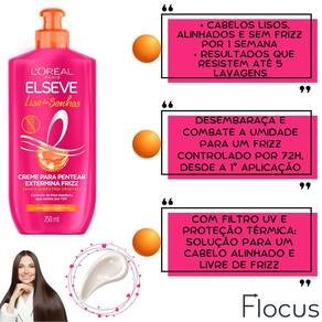 Kit Elseve Óleo Extraordinário Liso dos Sonhos AHA Queratina Bem vindo a a loja Flocus. É um prazer tê-lo a como nosso a cliente CONTEÚDO DO KIT: 1 Elseve Shampoo Super Alinhador Liso dos Sonhos Loreal Paris - 400ml 1 Elseve Condicionador Efeito Liquid Hair Liso dos Sonhos Loreal Paris - 400ml 1 Elseve Creme para Pentear Extermina Frizz Liso dos Sonhos Loreal Paris - 250ml 1 Óleo Extraordinário L'Oréal Paris Elseve - 100ml Chegooou A nova linha Elseve Liso dos Sonhos proporciona cabelos lisos, alinhados e sem frizz por 1 semana O Shampoo Super Alinhador limpa e fortalece a fibra preparando os fios para um liso de longa duração e com frizz controlado. O Condicionador Efeito Liquid Hair sela e restaura a superfície da fibra para um liso com efeito liquid hair: desmaiado, com movimento superfluido e brilho intenso. O Creme para pentear Extermina Frizz desembaraça e combate a umidade para um liso com frizz controlado por até 72h, desde a primeira aplicação. Com filtro UV e proteção térmica, o Creme para Pentear Extermina Frizz é a solução para um cabelo alinhado e livre de frizz. Resultados que resistem até 5 lavagens Para turbinar seu tratamento capilar, o kit contém o famoso e um dos mais vendidos Óleo de Tratamento Elseve Óleo Extraordinário Nutrição, pois ele tem a combinação perfeita de micro-óleos de flores preciosas, garantindo maciez e brilho aos cabelos. O segredo dos óleos de flores preciosas promovem uma nutrição perfeita e uma leveza infinita. Camomila Linhaça Girassol Gardênia Lótus Rosa Canina INDICAÇÃO: Cabelos naturalmente lisos, alisados e com frizz. MODO DE USO: Shampoo: Aplique em todo o comprimento, até as pontas. Deixe o produto agir e enxágue abundantemente. Condicionador: Aplique nos cabelos molhados Massageie suavemente e enxágue. Repita a aplicação se necessário. Creme para Pentear: Aplique no cabelo úmido ou seco Não enxágue. Penteie como de costume. Óleo Extraordinário: O Óleo Extraordinário de tratamento é leve e multiuso, pode ser tanto em cabelos molhados quanto secos Pode ser antes da escova para nutrir os fios; como finalizador para malear a fibra; em qualquer momento para disciplinar o frizz e ressaltar a luz dos cabelos. Agradecemos por escolher a Loja Flocus e por confiar em nós para cuidar da beleza dos seus cabelos. Em caso de dúvidas, favor enviar sua pergunta Flocus Marca: Não Informado