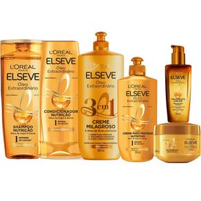 Kit Elseve Óleo Extraordinário Shampoo Condicionador 3 em 1 Bem vindo a a loja Flocus. É um prazer tê-lo a como nosso a cliente CONTEÚDO DO KIT: 1 Shampoo Elseve Óleo Extraordinário Nutrição Argan e Marula 200ml 1 Condicionador Elseve Óleo Extraordinário Nutrição Argan e Marula 200ml 1 Creme de tratamento Elseve Óleo Extraordinário Nutrição Óleos de Argan e Marula 300G 1 Creme para Pentear L'Oréal Paris Elseve Óleo Extraordinário - 250ml 1 Creme Milagroso 3 em 1 L'Oréal Paris Elseve Óleo Extraordinário 6 Óleos de Flores Preciosas - 500ml 1 Óleo Extraordinário L'Oréal Paris Elseve - 100ml Um cabelo seco parece estar sem vida, pois ele está opaco, sem brilho e tem um toque áspero. O kit Elseve Óleo Extraordinário Nutrição é perfeito para esse tipo de problema. A linha Elseve Óleo Extraordinário foi desenvolvida para nutrir cabelos secos, promovendo suavidade infinita, brilho excepcional e vitalidade deslumbrante. Com a tecnologia de micro óleos de argan e marula nutre os fios, sem pesar. O segredo dos óleos de argan e marula promovem uma nutrição perfeita e uma leveza infinita. Resultado: O cabelo fica cheio de vida, com toque sedoso e brilho deslumbrante. INDICAÇÃO: Cabelos secos Cabelos muito secos BENEFÍCIOS: Limpa, dá brilho e nutre; Fios Leves e com vitalidade; Cabelos hidratados e com textura leve; Promove Inovação; Possui micro óleos essenciais; Brilho excepcional; Vitalidade deslumbrante. MODO DE USAR: . Shampoo: Aplique nos cabelos molhados e massageie suavemente; Enxágue. Repita a operação se necessário. . Tratamento Nutritivo: Após o uso do Shampoo, aplique sobre os cabelos lavados e úmidos Deixe agir por 5 minutos Enxague bem. . Condicionador: Aplique o Condicionador em todo o comprimento até as pontas. Deixe o produto agir. Enxague abundantemente. . Creme 3 em 1: Pode ser como: Super Condicionador para Desembaraçar: aplique em todo comprimento até as pontas. Deixe agir por 3 minutos e enxágue. Tratamento Intensivo para Transformar: aplique em todo comprimento até as pontas. Deixe agir por 5 minutos ou mais e enxágue. Creme para Pentear para Hidratar e/ou Finalizar: aplique no cabelo úmido ou seco, não enxágue e penteie como de costume. . Creme para Pentear: Distribua igualmente uma pequena porção do produto ao longo de todo o comprimento e pontas dos cabelos úmidos Não enxague e penteie como de costume. . Óleo Extraordinário: O Óleo Extraordinário de tratamento é leve e multiuso, pode ser tanto em cabelos molhados quanto secos Pode ser antes da escova para nutrir os fios; como finalizador para malear a fibra; em qualquer momento para disciplinar o frizz e ressaltar a luz dos cabelos. Não perca a oportunidade de experimentar a magia dos cabelos extraordinários Agradecemos por escolher a Loja Flocus e por confiar em nós para cuidar da beleza dos seus cabelos. Em caso de dúvidas, favor enviar sua pergunta Flocus Marca: Não Informado Ean: 7735118890498