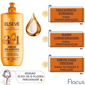 Kit Elseve Óleo Extraordinário Tratamento NutritivoMilagroso Bem vindo a a loja Flocus. É um prazer tê-lo a como nosso a cliente CONTEÚDO DO KIT: 1 Shampoo Elseve Óleo Extraordinário Nutrição Argan e Marula 200ml 1 Condicionador Elseve Óleo Extraordinário Nutrição Argan e Marula 200ml 1 Creme de tratamento Elseve Óleo Extraordinário Nutrição Óleos de Argan e Marula 300G 1 Creme Milagroso 3 em 1 L'Oréal Paris Elseve Óleo Extraordinário 6 Óleos de Flores Preciosas - 500ml 1 Óleo Extraordinário L'Oréal Paris Elseve - 100ml Um cabelo seco parece estar sem vida, pois ele está opaco, sem brilho e tem um toque áspero. O kit Elseve Óleo Extraordinário Nutrição é perfeito para esse tipo de problema. A linha Elseve Óleo Extraordinário foi desenvolvida para nutrir cabelos secos, promovendo suavidade infinita, brilho excepcional e vitalidade deslumbrante. Com a tecnologia de micro óleos de argan e marula nutre os fios, sem pesar. O segredo dos óleos de argan e marula promovem uma nutrição perfeita e uma leveza infinita. Resultado: O cabelo fica cheio de vida, com toque sedoso e brilho deslumbrante. INDICAÇÃO: Cabelos secos Cabelos muito secos BENEFÍCIOS: Limpa, dá brilho e nutre; Fios Leves e com vitalidade; Cabelos hidratados e com textura leve; Promove Inovação; Possui micro óleos essenciais; Brilho excepcional; Vitalidade deslumbrante. MODO DE USAR: . Shampoo: Aplique nos cabelos molhados e massageie suavemente; Enxágue. Repita a operação se necessário. . Tratamento Nutritivo: Após o uso do Shampoo, aplique sobre os cabelos lavados e úmidos Deixe agir por 5 minutos Enxague bem. . Condicionador: Aplique o Condicionador em todo o comprimento até as pontas. Deixe o produto agir. Enxague abundantemente. . Creme 3 em 1: Pode ser como: Super Condicionador para Desembaraçar: aplique em todo comprimento até as pontas. Deixe agir por 3 minutos e enxágue. Tratamento Intensivo para Transformar: aplique em todo comprimento até as pontas. Deixe agir por 5 minutos ou mais e enxágue. Creme para Pentear para Hidratar e/ou Finalizar: aplique no cabelo úmido ou seco, não enxágue e penteie como de costume. . Óleo Extraordinário: O Óleo Extraordinário de tratamento é leve e multiuso, pode ser tanto em cabelos molhados quanto secos Pode ser antes da escova para nutrir os fios; como finalizador para malear a fibra; em qualquer momento para disciplinar o frizz e ressaltar a luz dos cabelos. Não perca a oportunidade de experimentar a magia dos cabelos extraordinários Agradecemos por escolher a Loja Flocus e por confiar em nós para cuidar da beleza dos seus cabelos. Em caso de dúvidas, favor enviar sua pergunta Flocus Marca: Não Informado