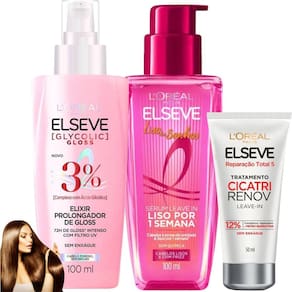 Kit Elseve Sérum Leave In Cicatri Renov Elixir Glycolic Bem vindo a a loja Flocus. É um prazer tê-lo a como nosso a cliente CONTEÚDO DO KIT: 1 Elseve Sérum Leave-in Liso Por 1 Semana Liso dos Sonhos L'oreal Paris - 100ml 1 Sérum Elixir Prolongador de Gloss L'Oréal Paris Elseve Glycolic Gloss - 100ml 1 leave-in Cicatri Renov Elseve Reparação Total 5 - 50ml Chegooou A nova linha Elseve Liso dos Sonhos proporciona cabelos lisos, alinhados e sem frizz por 1 semana O Sérum Leave-in LOréal Paris Elseve Liso dos Sonhos é um finalizador capilar desenvolvido para quem deseja um cabelo mais liso, alinhado e protegido contra a umidade. Sua tecnologia ativada por calor cria uma barreira invisível na fibra capilar, proporcionando um efeito de cabelos lisos por até 1 semana. Resultados que resistem até 5 lavagens Cabelo poroso e sem brilho A linha Elseve Glycolic Gloss de LOréal Paris garante 3X mais gloss que resiste a 6 lavagens. Sua fórmula com pH Ácido rica em Ácido Glicólico, combate a porosidade e sela as cutículas para um cabelo visivelmente saudável e alinhado para um brilho gloss. O sérum Prolongador de Gloss Elixir, com uma inovadora fórmula com pH ácido e enriquecida com 3% Complexo com Ácido Glicólico, filtro UV e proteção térmica, possui tripla ação: 1. Sela intensamente os fios, preenchendo as falhas da fibra capilar. 2. Na superficie, lamina a cutícula, alinhando-a para refletir a luz. 3. Protege os fios contra futuras agressões externas. Cabelo visivelmente saudável e alinhado para um brilho gloss que dura até 72h. O Leave-In Cicatri Renov Elseve Reparação Total 5 identifica e repara os danos fio a fio do cabelo sem pesar. Possui 10 benefícios para uma plástica capilar: Reparação instantânea; Selagem das pontas; 100% mais brilho; Maciez profunda; Toque deslizante; Desembaraço imediato; 10x menos quebra; Anti-frizz; Anti-umidade; Proteção térmica. Para todos os tipos de cabelo, renova e protege a qualquer hora e em qualquer lugar. Pode ser com o cabelo seco ou molhado, antes ou depois do secador. MODO DE USO: Sérum: aplique somente nos cabelos úmidos, do comprimento as pontas cobrindo todos os fios. na 1 aplicação da semana, ative a fórmula com a chapinha após a secagem. ao longo da semana, após cada lavagem reaplique e ative somente com o secador. esqueça a chapinha por 1 semana. agite antes de usar. Elixir: Aplicar nos cabelos molhados ou secos Pode usar antes da escova ou como finalizador para malear a fibra Sem enxágue. Leave-in: Distribua uma pequena quantidade nos fios secos ou úmidos, do comprimento às pontas. Não enxague OBS: Com proteção térmica, pode ser antes ou depois de escova ou chapinha. Agradecemos por escolher a Loja Flocus e por confiar em nós para cuidar da beleza dos seus cabelos. Em caso de dúvidas, favor enviar sua pergunta Flocus Marca: Não Informado Ean: 7735118889249