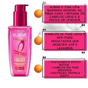Kit Elseve Sérum Leave In Novo dos Sonhos Cicatri Renov Óleo Bem vindo a a loja Flocus. É um prazer tê-lo a como nosso a cliente CONTEÚDO DO KIT: 1 Elseve Sérum Leave-in Liso Por 1 Semana Liso dos Sonhos L'oreal Paris - 100ml 1 Óleo Extraordinário L'Oréal Paris Elseve - 100ml 1 leave-in Cicatri Renov Elseve Reparação Total 5 - 50ml Chegooou A nova linha Elseve Liso dos Sonhos proporciona cabelos lisos, alinhados e sem frizz por 1 semana O Sérum Leave-in LOréal Paris Elseve Liso dos Sonhos é um finalizador capilar desenvolvido para quem deseja um cabelo mais liso, alinhado e protegido contra a umidade. Sua tecnologia ativada por calor cria uma barreira invisível na fibra capilar, proporcionando um efeito de cabelos lisos por até 1 semana. Resultados que resistem até 5 lavagens O Óleo de Tratamento Elseve Óleo Extraordinário Nutrição tem a combinação perfeita de micro-óleos de flores preciosas, garantindo maciez e brilho aos cabelos. Sua fórmula rica em 6 óleos de flores raras da natureza é leve e se adapta a todos os tipos de cabelos. Perfeita mistura de ingredientes ativos que transforma todos os tipos de cabelos. O óleo promove brilho e nutrição intensa aos fios, controla o frizz, protege o cabelo de temperaturas elevadas, trata de maneira profunda na umectação capilar e turbina máscaras de tratamento através da sua mistura. O Óleo Extraordinário Elseve de L'Oréal Paris é um delicado óleo que proporciona tratamento para a beleza dos seus cabelos. Possui 6 óleos de flores preciosas, com efeito condicionante, capaz de transformar a fibra para tornar sublime qualquer tipo de cabelo. O segredo dos óleos de flores preciosas promovem uma nutrição perfeita e uma leveza infinita. Camomila Linhaça Girassol Gardênia Lótus Rosa Canina O Leave-In Cicatri Renov Elseve Reparação Total 5 identifica e repara os danos fio a fio do cabelo sem pesar. Possui 10 benefícios para uma plástica capilar: Reparação instantânea; Selagem das pontas; 100% mais brilho; Maciez profunda; Toque deslizante; Desembaraço imediato; 10x menos quebra; Anti-frizz; Anti-umidade; Proteção térmica. Para todos os tipos de cabelo, renova e protege a qualquer hora e em qualquer lugar. Pode ser com o cabelo seco ou molhado, antes ou depois do secador. MODO DE USO: Sérum: aplique somente nos cabelos úmidos, do comprimento as pontas cobrindo todos os fios. na 1 aplicação da semana, ative a fórmula com a chapinha após a secagem. ao longo da semana, após cada lavagem reaplique e ative somente com o secador. esqueça a chapinha por 1 semana. agite antes de usar. Óleo: O Óleo Extraordinário de tratamento é leve e multiuso, pode ser tanto em cabelos molhados quanto secos Pode ser antes da escova para nutrir os fios; como finalizador para malear a fibra; em qualquer momento para disciplinar o frizz e ressaltar a luz dos cabelos. Leave-in: Distribua uma pequena quantidade nos fios secos ou úmidos, do comprimento às pontas. Não enxague OBS: Com proteção térmica, pode ser antes ou depois de escova ou chapinha. Agradecemos por escolher a Loja Flocus e por confiar em nós para cuidar da beleza dos seus cabelos. Em caso de dúvidas, favor enviar sua pergunta Flocus Marca: Não Informado