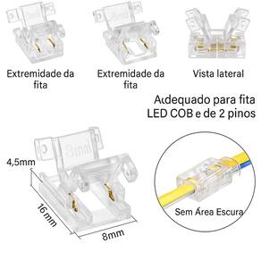 Especificações Técnicas Compatível com fita LED COB de 2 pinos (largura 8mm) Instalação sem solda (encaixe por pressão) Material: Plástico transparente resistente Tensão: 12V ou 24V (conforme a fita LED utilizada) Corrente máxima: 5A