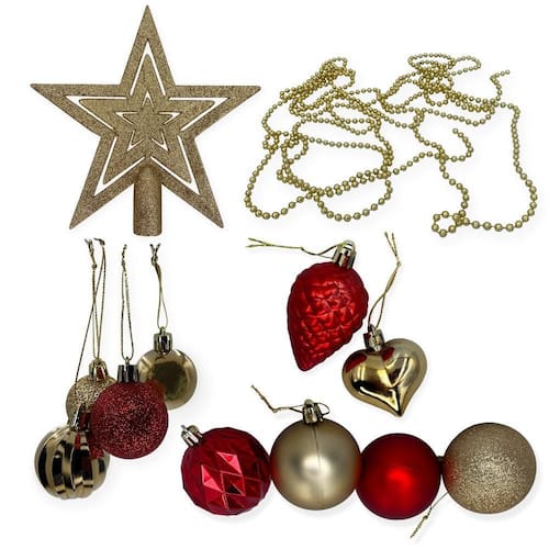 Conteúdo do Pacote: - 01 Kit de Enfeites de Natal com Bolas, Cordão de Pérolas e Estrela - Dourado e Vermelho.