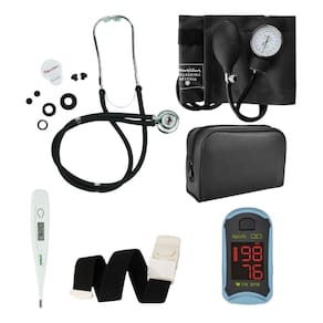 Kit Acadêmico completo Premium.Incluso:01 Estetoscópio Rappaport Premium01 Esfigmomanômetro Premium01 Garrote de Elastano Preto01 Termômetro Axilar Branco Haste Rígida G-Tech01 Oximetro de Dedo G-techTodos os Itens homologado pela Anvisa e Certificado Pelo InmetroUso para Técnicos de enfermagem, Enfermeiros, Cuidadores, Fisioterapeutas, Homecare e Médicos.Todos Os Itens Calibrador e pronto para uso.