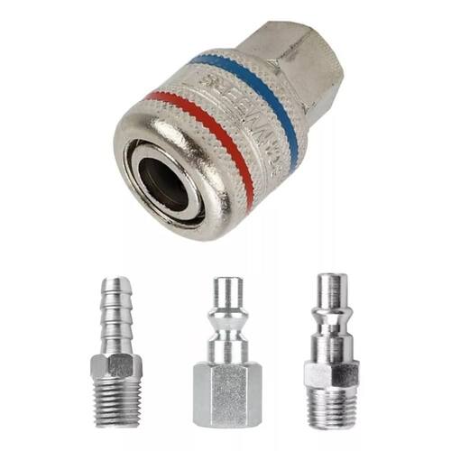 Contém 4 peças: - 1 Engate rápido - 1 Pino rosca 1/4'' macho NPT - 1 Pino rosca 1/4'' fêmea NPT - 1 Pino com escama de 1/4'' Válvula metálica: Durável e resistente Válvula que trava passagem do ar quando o pino estiver desconectado Composição: Zamac e latão Engate de 1/4'' Rosca fêmea Fácil instalação e manuseio Peso: 140g Cor: Prata Validade indeterminada Produto não perecível