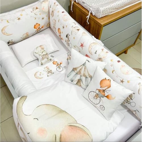 Kit Enxoval de Berço 10 Peças Micropercal Poliéster 200 Fios - Infanto Circo Uma composição exclusiva, moderna e inovadora, confeccionada em micropercal 200 fios - 100% poliéster com toque acetinado, indicada para berço padrão americano. Possui protetor cabeceira e protetor lateral estampado, com amarris para maior segurança. Conta também com um protetor rolinho todo branco com detalhes em delicadas nervuras. Os protetores possuem zíper para retirada do enchimento, facilitando a lavagem do produto. Seu edredom é o ponto alto do enxoval, conta com uma estampa circense, em tamanho master, que na hora de cobrir vira uma verdadeira diversão. O jogo de lençol possui 3 peças sendo o lençol de baixo com elástico na volta toda, o lençol de cima possui uma vira com detalhe da estampa e uma fronha toda branca. Acompanha 3 almofadinhas divertidas. Aposte nessa tendência e deixe o quartinho do seu bebê ainda mais exclusivo e divertido.