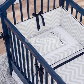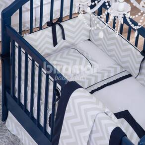 Kit Enxoval para Berço Brooklyn Chevron Cinza/Marinho 10 Peças Produto composto por: 01 Edredom para Berço 1,45m x 95cm 01 Cabeceira de Berço 68cm x 27cm 02 Laterais 1,25m x 27cm cada 01 Trocador para Bebê 65cm x 46cm 01 Lençol de Cima 1,45m x 95cm 01 Lençol de Baixo com Elástico 1,60m x 1,00m 01 Fronha 38cm x 28cm 01 Rolo para Trocador 62cm x 5cm 01 Soninho Elefante 39cm x 34cm x 12cm