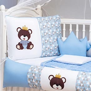 1 edredom 130cm x 75cm 1 cabeceira 0.60 x 0.40 1 lateral 1.28 x 0.25 1 trança 1.28 x 0.12 1 fronha 0,28 x 0,38 1 lençol de cima com bainha 1 bando do mosqueteiro 1.40 x 0.20 1 mosqueteiro 4.50 x 1.50 1 almofada 0.40 x 0.30 1 trocador 0,60 x 0,45 1 saia box 1,30 x 0,70 x 0,30